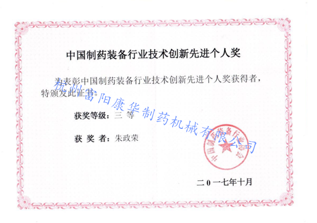 祝賀朱政榮董事長(zhǎng)中國制藥裝備行業(yè)技術(shù)創(chuàng)新先進(jìn)個(gè)人三等獎(jiǎng)!