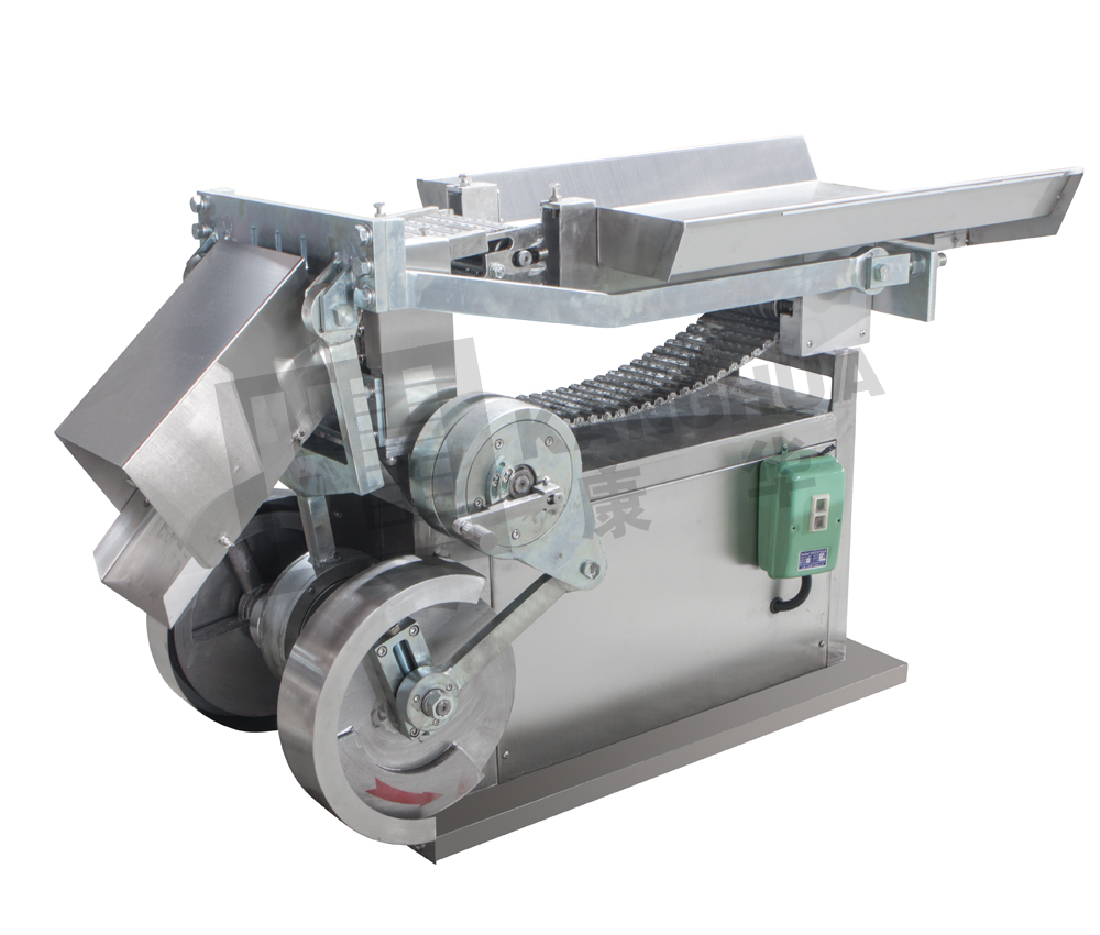 采用機械偏心機構(gòu)傳動,使刀片上下往復(fù)運動,原料經(jīng)輸送鏈送至刀門,切制成所需要厚度的飲片。