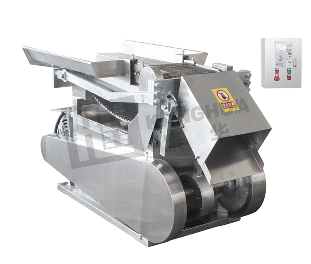 采用機(jī)械偏心機(jī)構(gòu)傳動(dòng),使刀片上下往復(fù)運(yùn)動(dòng),原料經(jīng)輸送鏈送至刀門(mén),切制成所需要厚度的飲片。